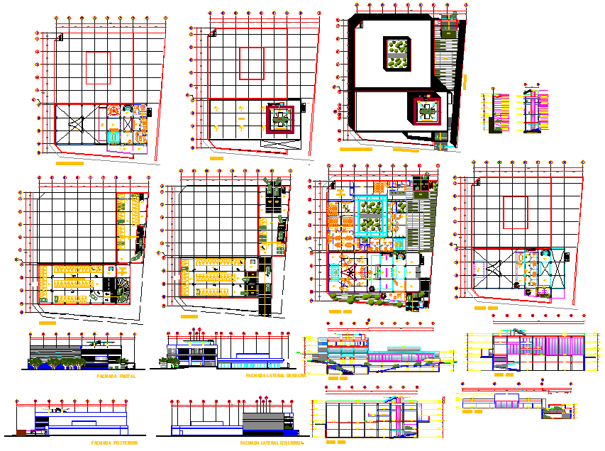 Administrative Center, architecture layout with detailing, sectional plan, structure plan, constructional plan, sectional elevation of individual floor, exterior elevation, exterior landscaping.