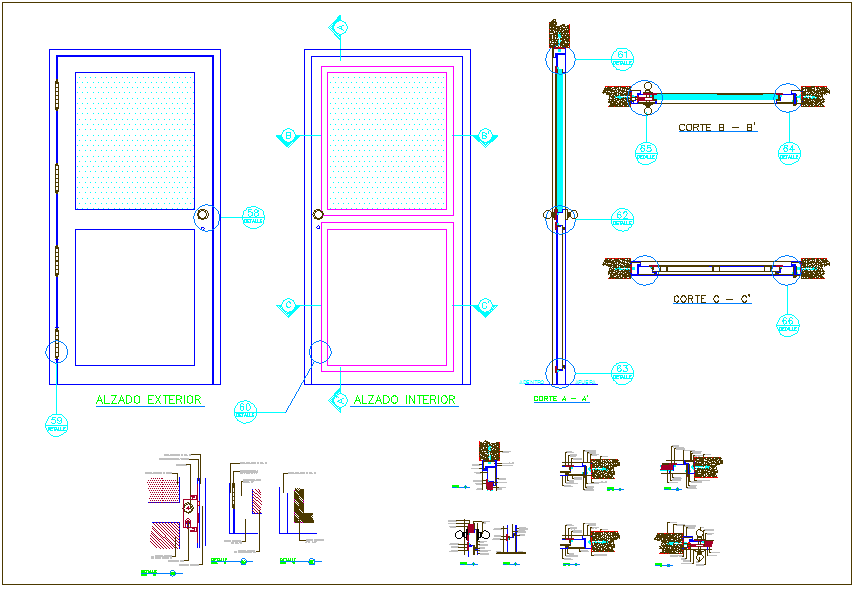 Door design with exterior and interior view dwg file with door view,hinge and round