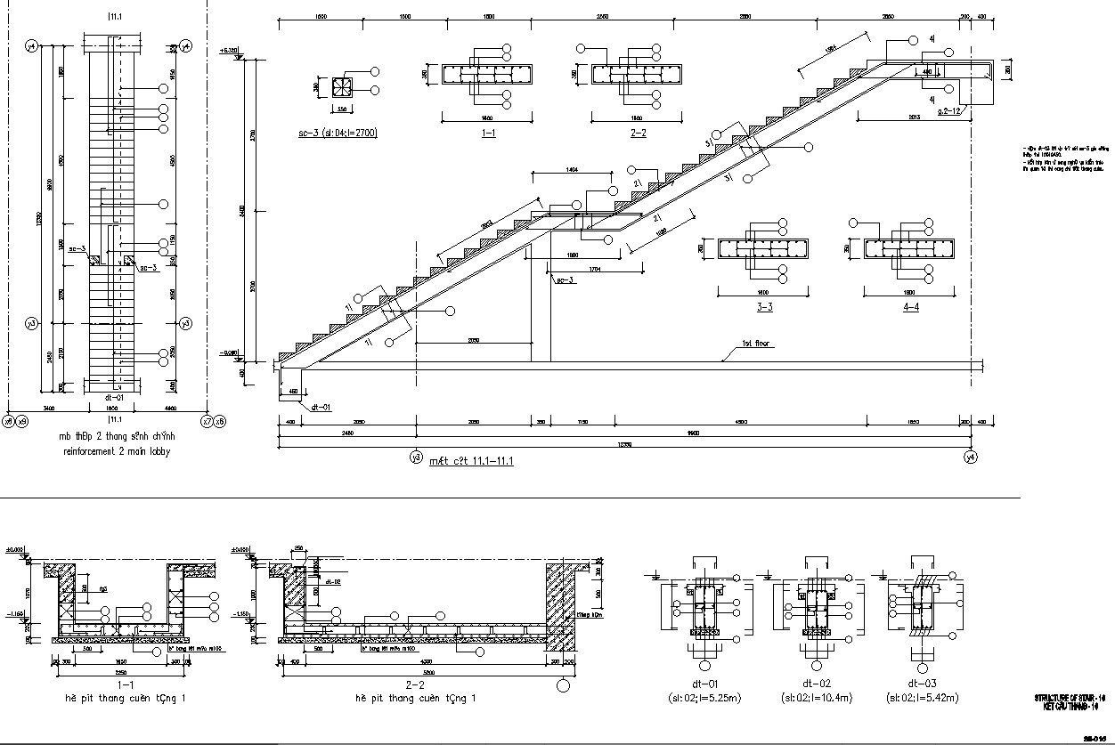 This architectural drawing is Structure of stair with reinforcement details. In this drawing there were give three details. In first details it is 5.25m, in second detail it is 10.4m, in third detail it is 5.42m. For more details and information download the drawing file.
