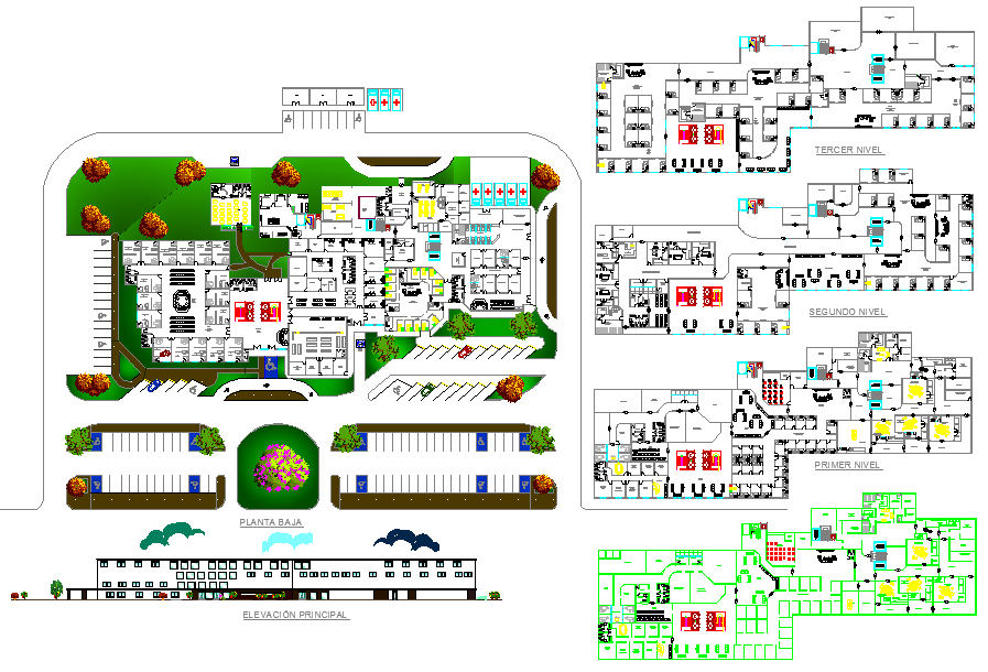Private Hospital, architecture layout with detailing, sectional plan, structure plan, constructional plan, sectional elevation of individual floor, exterior elevation,landscaping.