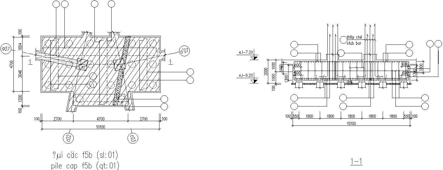 This Architectural Drawing is AutoCAD 2d drawing of Plan And section of pile cap details on reinforcement. A pile cap is a thick concrete mat that rests on concrete or timber piles that have been driven into soft or unstable ground to provide a suitable stable foundation. Total Cutting Length for Vertical Reinforcement = Anchorage Length at the bottom of the pile + the height of the pile + development length (40d) + Lap length (50d) – clear cover provided at the bottom. For more details and information download the drawing file.