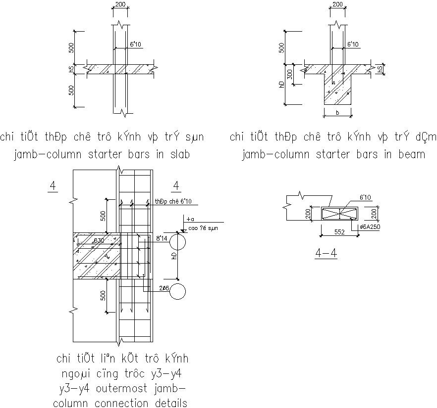 This architectural drawing is Jamb column starter bar in slab. In thia drawing there were column connection details, jamb- column starter bars in slab are given with detailing. Column starter is a smaller part of the column of concrete material with the same length and breadth of column which give guideline for column extend for perfect layout. For more details and information download the drawing file.
