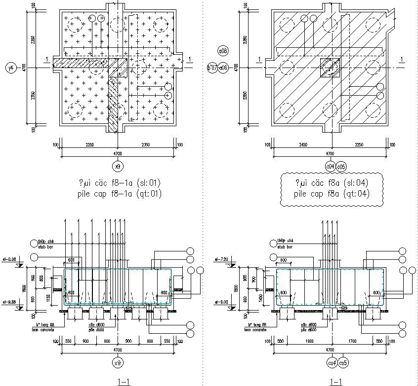 This Architectural Drawing is AutoCAD 2d drawing of Two plans and section of pile cap details. The pile cap should overhang the outer piles, typically by a distance of 100-150 mm on all sides, depending on the size of the piles. Pile caps are constructed by excavating an area around the group of piles to enable formwork to be inserted. The pile tops may be trimmed to ensure they are at the same height. For more details and information download the drawing file.