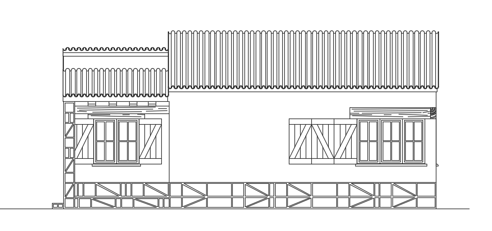 10x8m house building right side elevation without chimney 2d drawing is given in this model. Here, master bedroom window, bathroom ventilation, and kitchen window is visible.
