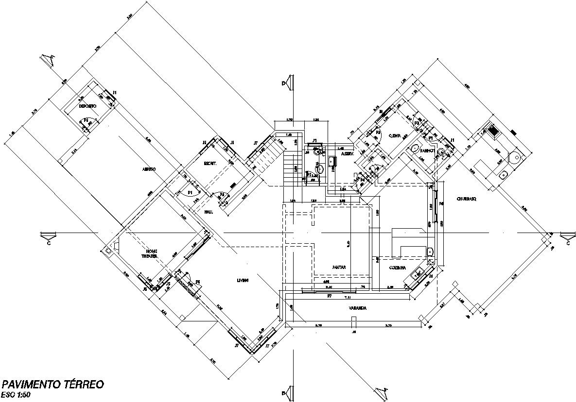 This architectural drawing is Ground floor plan of house. A ground plan shows the basic outlined shape of a building and, usually, the outlines of other interior and exterior features. For more details and information download the drawing file.