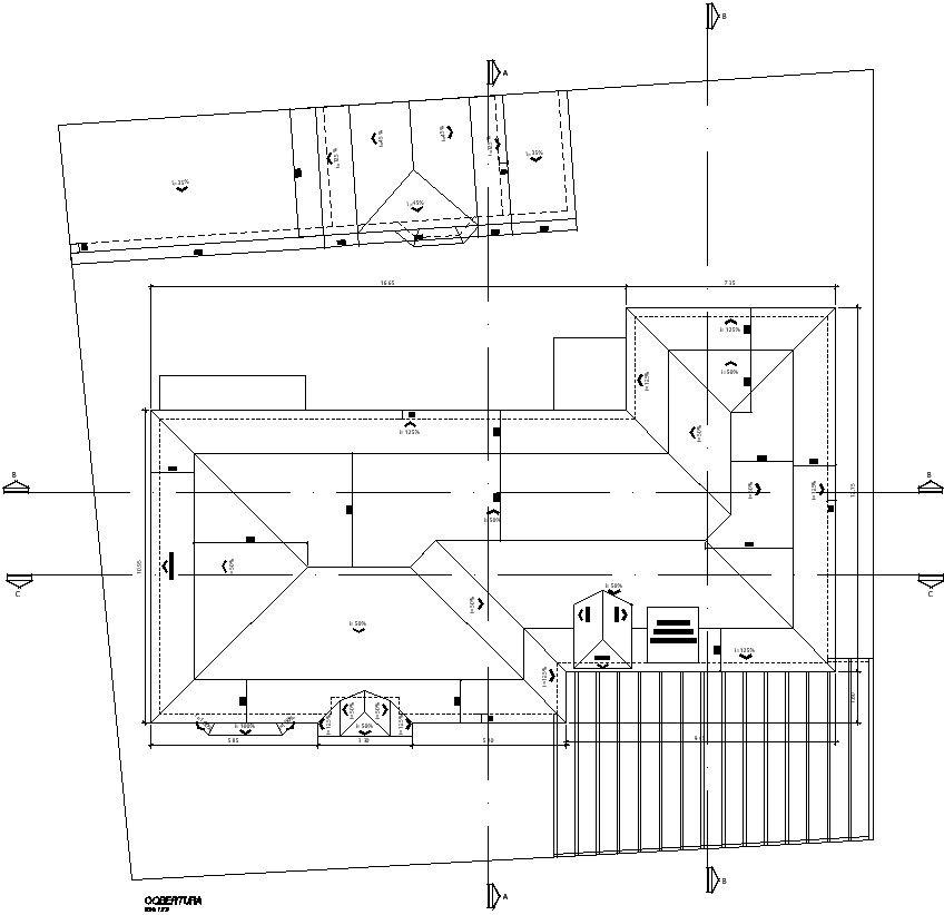 This architectural drawing is House plan with roof detailing. A roof is the top covering of a building, including all materials and constructions necessary to support it on the walls of the building or on uprights, providing protection against rain, snow, sunlight, extremes of temperature, and wind. For more details and information download the drawing file.