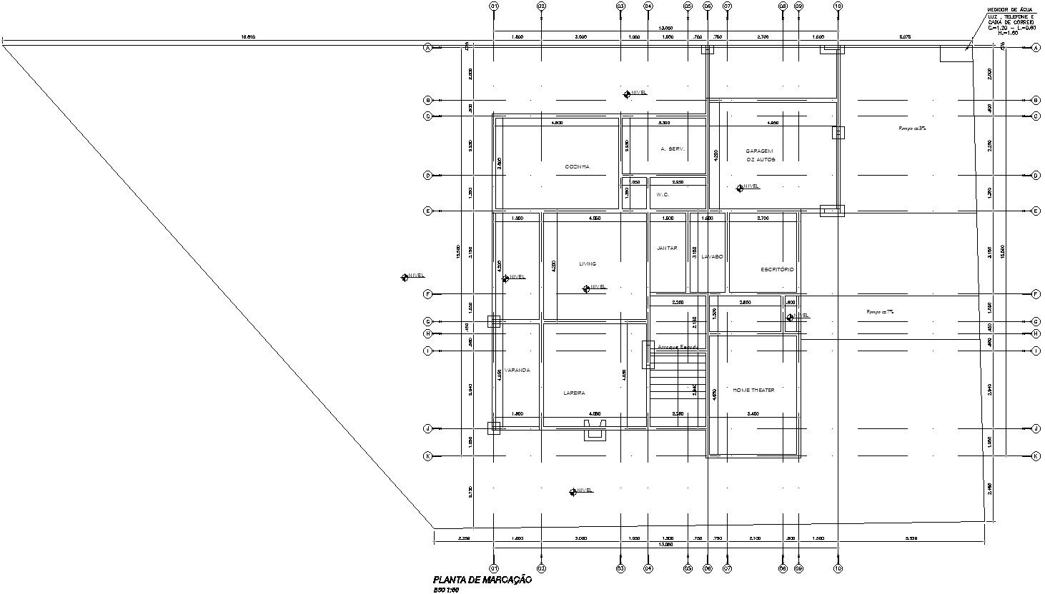 This architectural drawing is Marking of floor plan with detailing. In this drawing there were garage, dining room, home theatre room, living room, washroom, bathroom etc. are given with marking and dimensions. For more details and information download the drawing file.