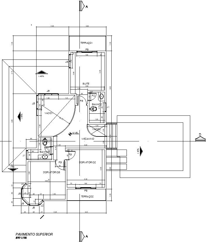 This architectural drawing is Upper floor plan with dimensions. In this plan there were two bedrooms, common washrooms, bathroom, suits etc. are given with dimensions. A mezzanine floor is an intermediate floor between main floors of a building, and therefore typically not counted among the overall floors of a building. For more details and information download the drawing file.