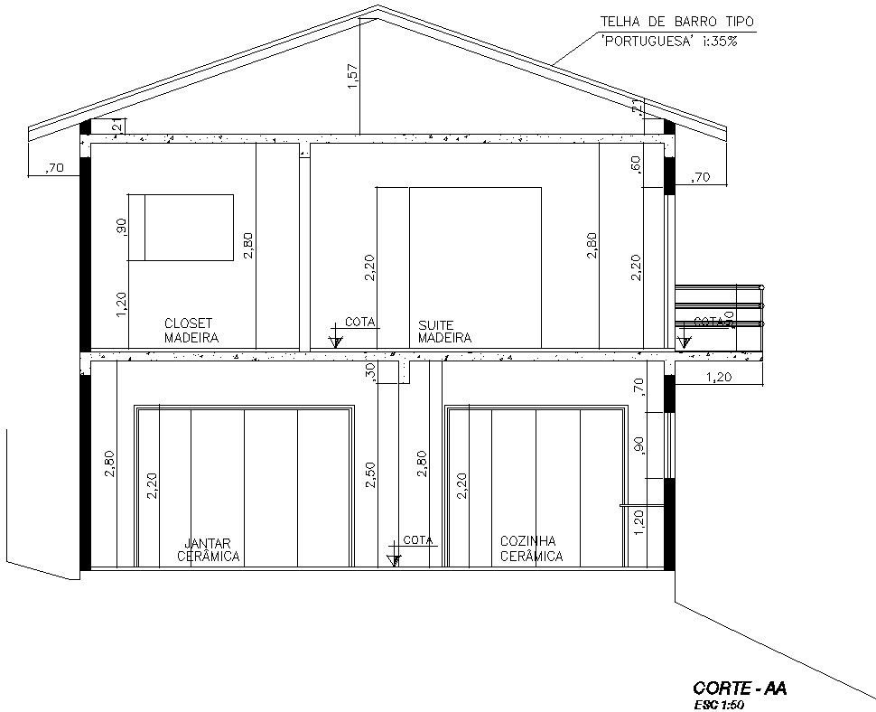 This architectural drawing is Section AA of 2 storey house plan. In this section The distance between two slabs is 2.80m. The height of roof is 1.57m, height of door is 2.20m, height of window is 0.90m. There were hanging roof length is 0.70m. For more details and information download the drawing file.