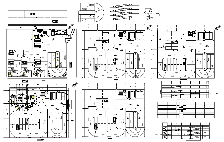 Parking with Offices, architecture layout with details, sectional plan, structure plan, constructional plan, sectional elevation of individual floor.