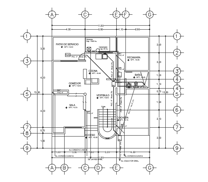 12x14m two story duplex house plan ground floor water line layout is given. Here, the water lines are provided to the patio service, common bathroom, and kitchen. The capacity of cistern is 7500lts. In this, 4” PVC pipe line is provided.