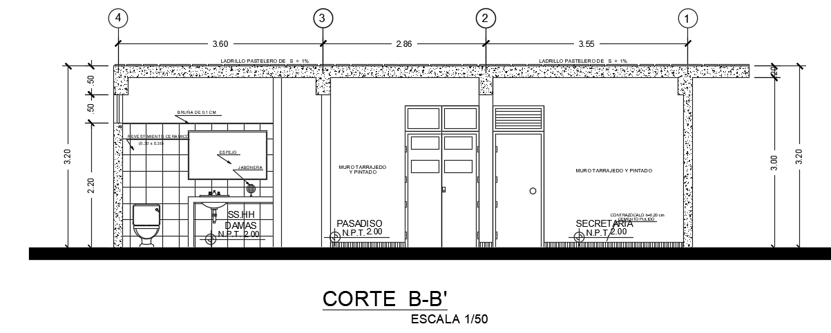 The left side section view of the 10x10m college administrative office building is given. Here, secretary room, passage, and bathroom is available.