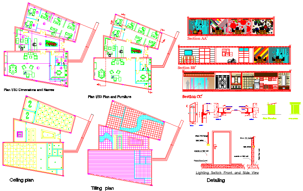 Offices and 4 Administrative Areas, architecture layout with detailing, sectional plan, structure plan, constructional plan, sectional elevation , ceiling layout, tiling plan, furniture layout, material and color specification.