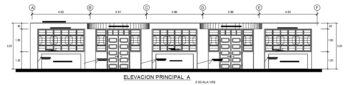 Here, the front elevation view of the 20x7m college multipurpose building is given. This is a single story building with the height of 3.2m. In this drawing, the main door, window, and other details are mentioned.