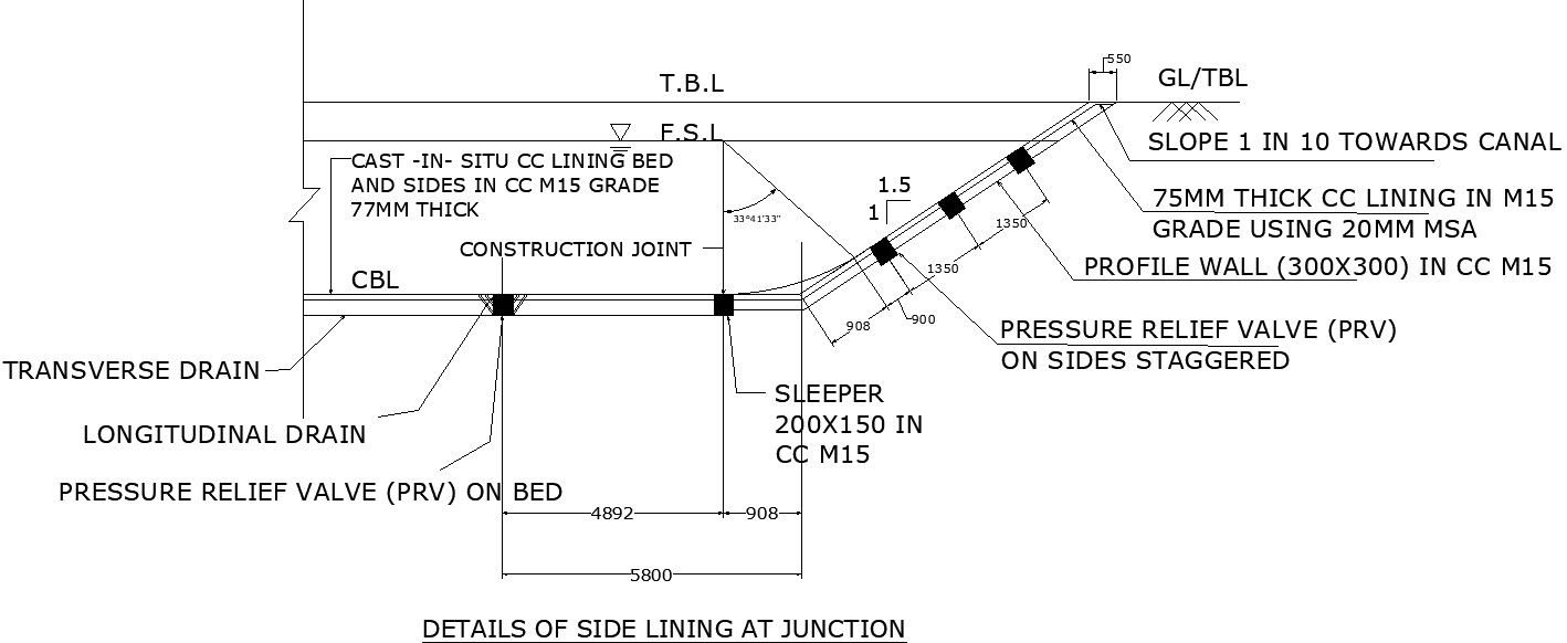 This Architectural Drawing is AutoCAD 2d drawing of Details of side lining junction. Canal lining is the process of reducing seepage loss of irrigation water by adding an impermeable layer to the edges of the trench. Seepage can result in losses of 30 to 50 percent of irrigation water from canals, so adding lining can make irrigation systems more efficient. For cement concrete lining, the safe limiting velocity is 2.7 m/s. For boulder lining, it is 1.5 m/s and for burnt clay tile lining it is approximately 1.8 m/s. This serves as a guide for selecting canal slopes and alignments. For more details and information download the drawing file.