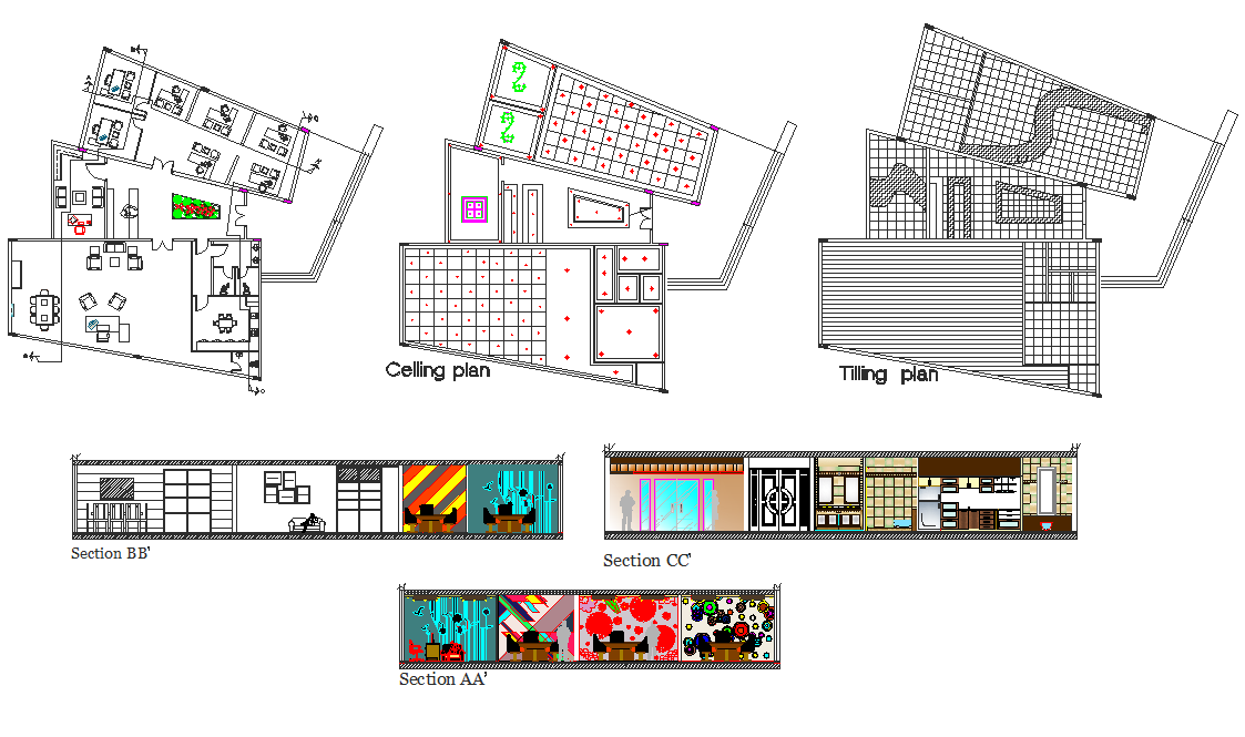 Offices and 4 Administrative Areas, architecture layout with detailing, sectional plan, structure plan, constructional plan, sectional elevation , ceiling layout, tiling plan, furniture layout, material and color specification.