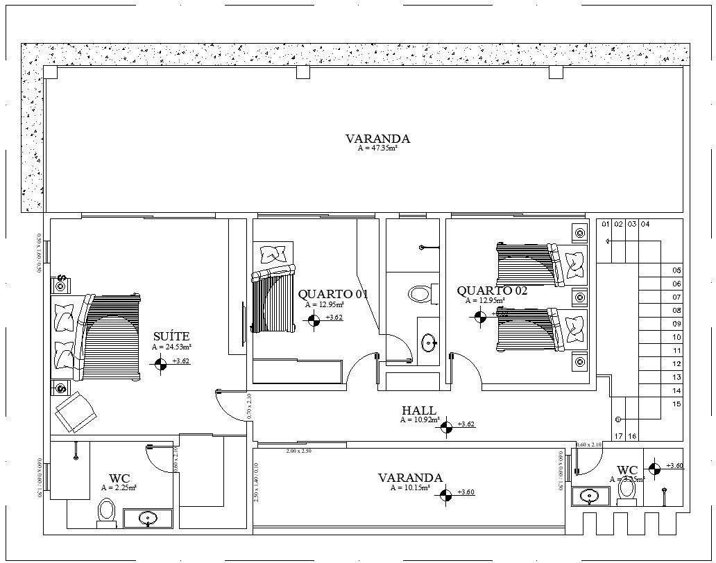 This architectural drawing is Floor plan with interior design and detailing. In this drawing there are verandah is 47.35 sq.m., bedroom is 12.95sq.m., kids bedroom is 12.95sq.m., toilet is 2.25sq.m., hall is 10.92sq.m. etc. are given. For more details and information download the drawing file.