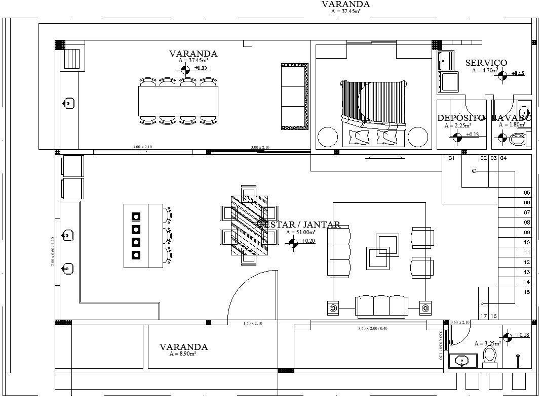 This architectural drawing is Ground floor plan with interior design. In this drawing there were kitchen, dining room, verandah, living room, bedroom with attached toilet-bathroom, common toilet-bathroom etc. given with detailing. For more details and information download the drawing file.