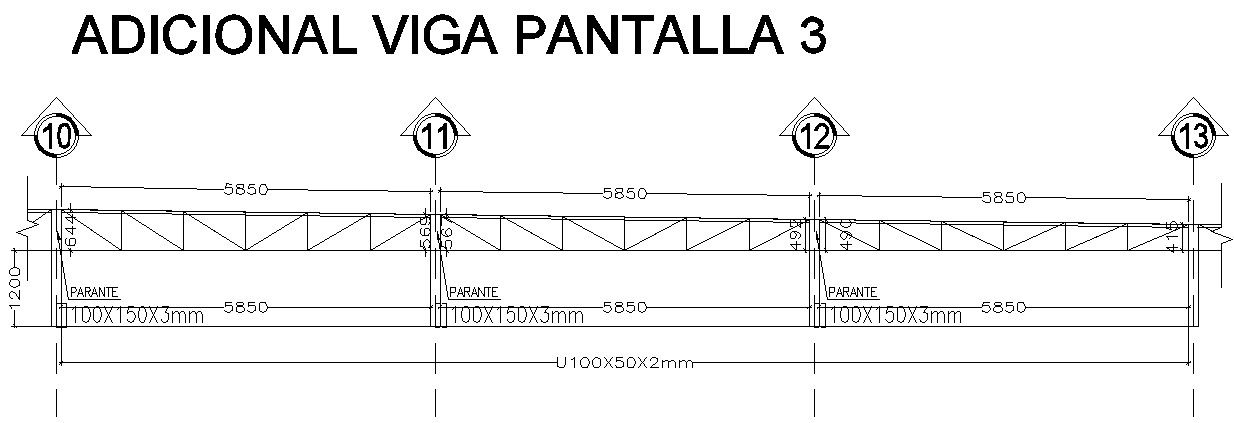 This architectural drawing is Design of screen beam with four stands. In this drawing there were distance between two stands are 5850mm is given. There were given sections size is 100x50x2mm. For more details and information download the drawing file.