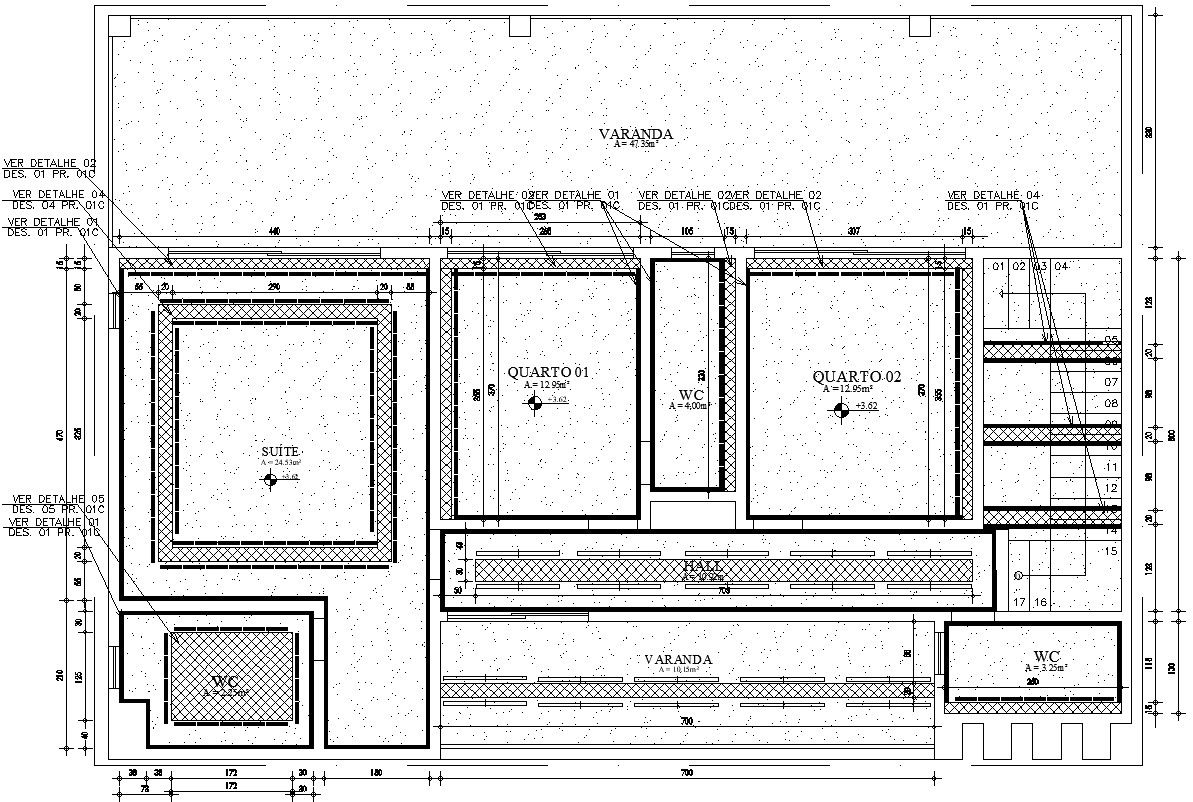 This architectural drawing is Design of First floor plan. In this drawing there were one master bedroom and two bedrooms with attached toilet-bathroom, common toilet-bathroom, verandah etc. are given with details. For more details and information download the drawing file.