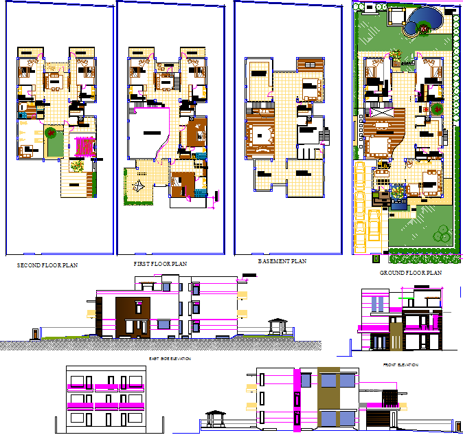 This Residential Bungalow AutoCAD DWG drawing provides a complete architectural layout with basement, ground, first, and second floor plans. Each plan includes detailed room arrangements, furniture layouts, and circulation spaces with accurate measurements. The drawing also features an outdoor landscape design, including a garden and swimming pool area, adding aesthetic and functional value to the bungalow. These detailed layouts make it ideal for architects, interior designers, and civil engineers working on residential projects.