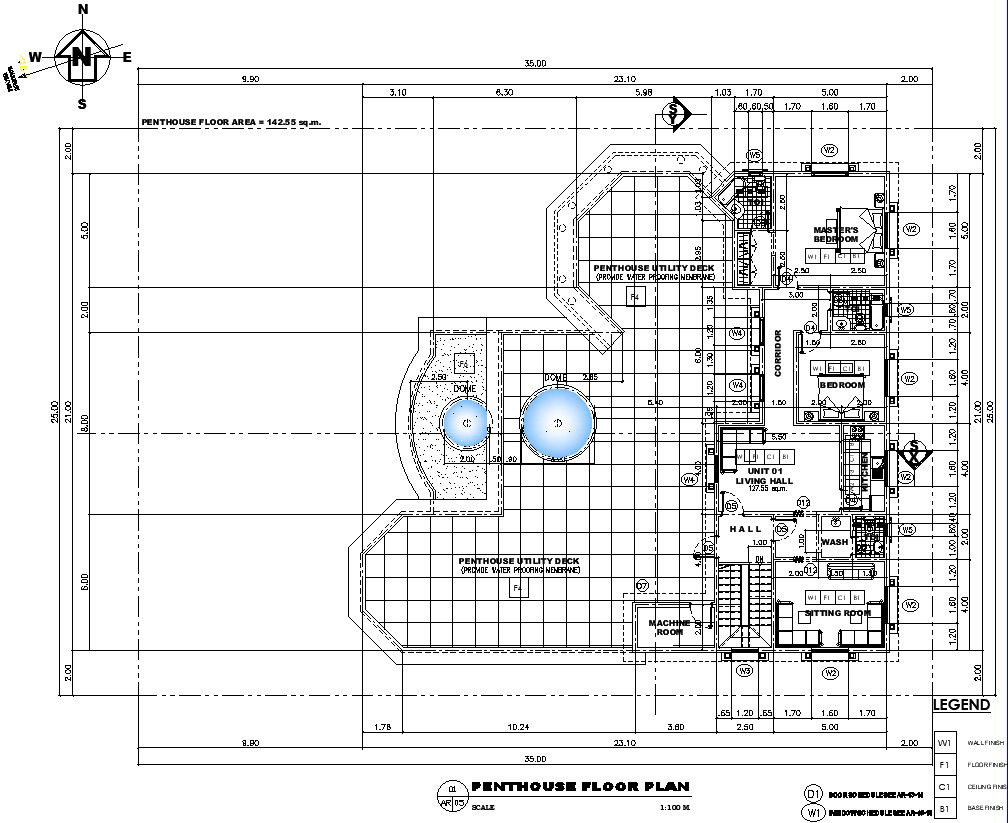 This architectural drawing is Pent house floor plan AutoCAD drawing. In this drawing there were kitchen, wash area, living room, dining room, master bedroom, bedroom, toilet- bathroom, sitting room etc. are available with details. For more details and information download the drawing file.