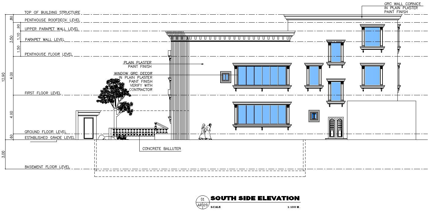 This architectural drawing is South side elevation of pent house AutoCAD drawing. In this drawing there were window deign, door design, different sections etc. are available with details. For more details and information download the drawing file.