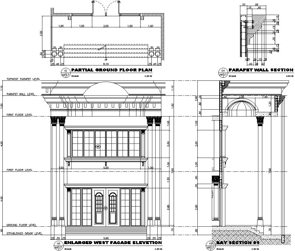 This architectural drawing is West facade elevation with partial ground floor plan and parapet wall section AutoCAD drawing. In this drawing there were wall detail section, door details, column details, different section details etc. are available with details. For more details and information download the drawing file.
