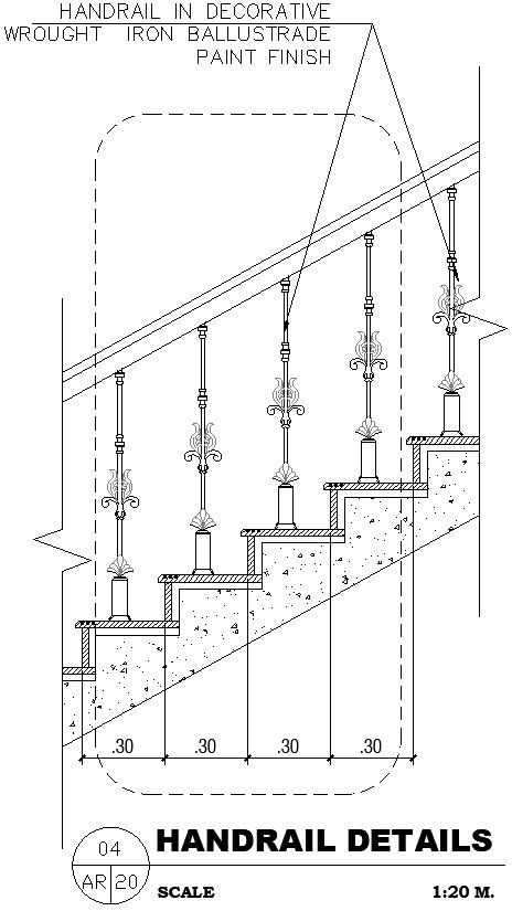 This architectural drawing is Handrail detail AutoCAD drawing. In this drawing there were handrail in decorative wrought iron balustrade paint finish given. For more details and information download the drawing file.