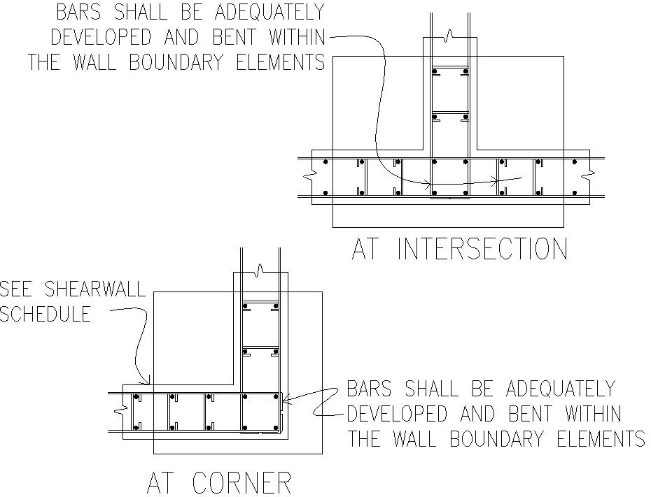 Column bar intersection details including bar shall adequately developed and bent within wall boundary element of at intersection and at corner for more details of Column bar intersection download autocad file , cad drawing , dwg format
