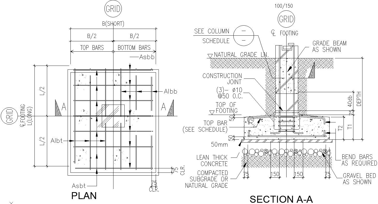 Column structure details including top bars and bottom bars lean thk concrete , compacted sub grade or nature grade , bend bar as required , grade beam as shown , construction joint, top footing ,top bars for more details of Column structure download autocad file, cad drawing ,dwg format