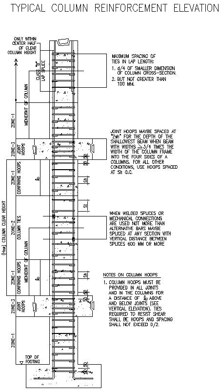 Column reinforcement elevation details including joint hoops and conflings hoops , only whithin centre half of column half of column, when welded splices or mechanical connection are used not more than alternative bars may be spliced at any section with vertical distance between splices 600mm or more details of Column reinforcement elevation download autocad file, cad drawing ,dwg format