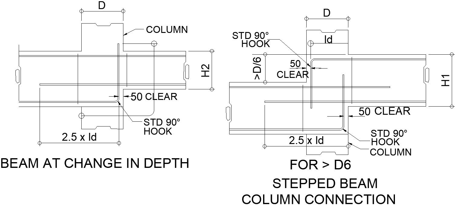 Beam and column scheduling details including beam at change in depth , stepped in column connection std 90 hook column , column , 50 clear , for more details of Beam and column scheduling download autocad file, cad drawing ,dwg format