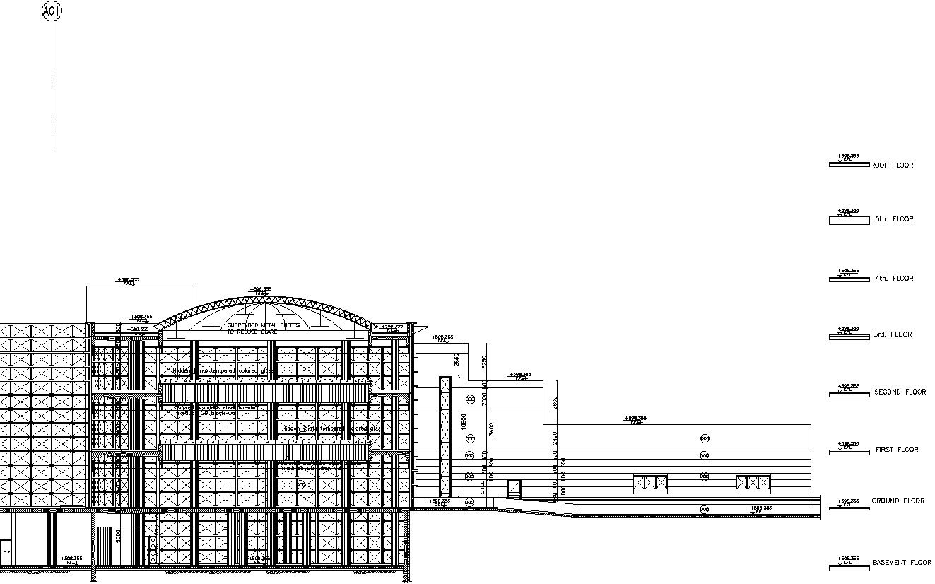 This architectural drawing is Commercial building detail AutoCAD drawing. In this drawing there were used suspended metal sheets in roof for reducing glare. This is G+5 storey building. For more details and information download the drawing file.