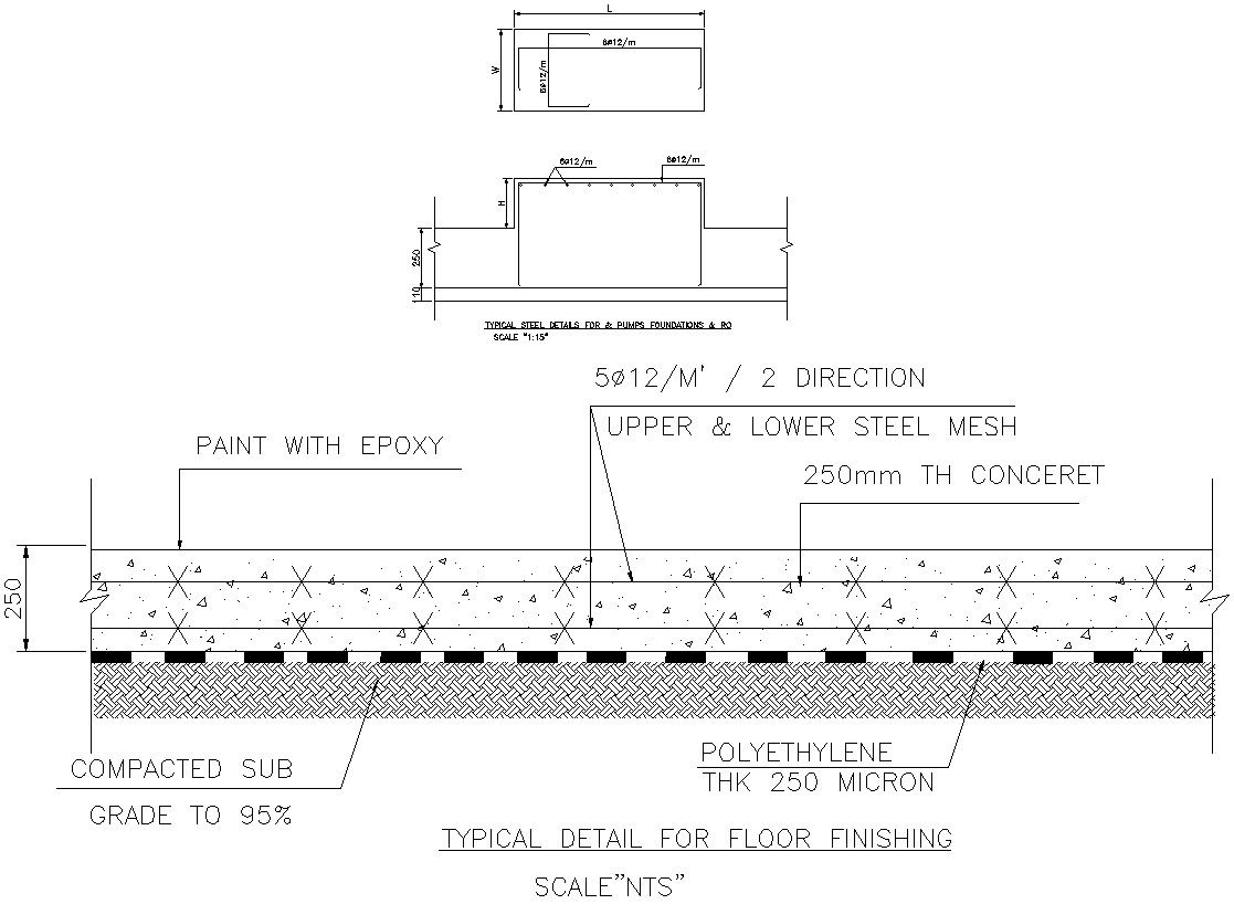 This Architectural Drawing is AutoCAD 2d drawing of Typical details of pump foundation and floor finish. In general, a pump should be mounted on a strong baseplate supported by a strong concrete foundation. It is also necessary to properly connect the pump to the system by accurately aligning it to the piping system, as well as the driving motor. Floor finishes in commercial and institutional uses make considerable use of synthetic-fibre carpeting and vinyl composition tile. In areas of higher traffic harder surfaces may be used—for example, cut stone tiles of marble or granite, ceramic tile applied with epoxy adhesive to the substrate, or terrazzo. For more details and information download the drawing file.