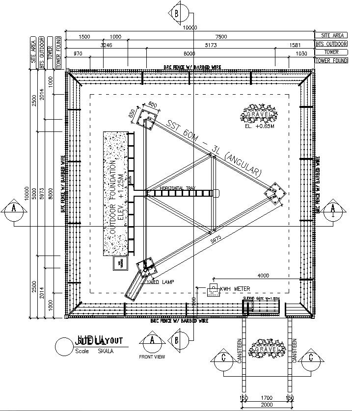 Legged tower structure detail including sst- 6o m angular , horizontal tray , outdoor foundation elevation +1.25M , kwh meter , yard covered with brc fence and barbed wire also show sliding gate 1.50 m , yard lamp for more details of Legged tower structure download Autocad file ,cad drawing , dwg format.