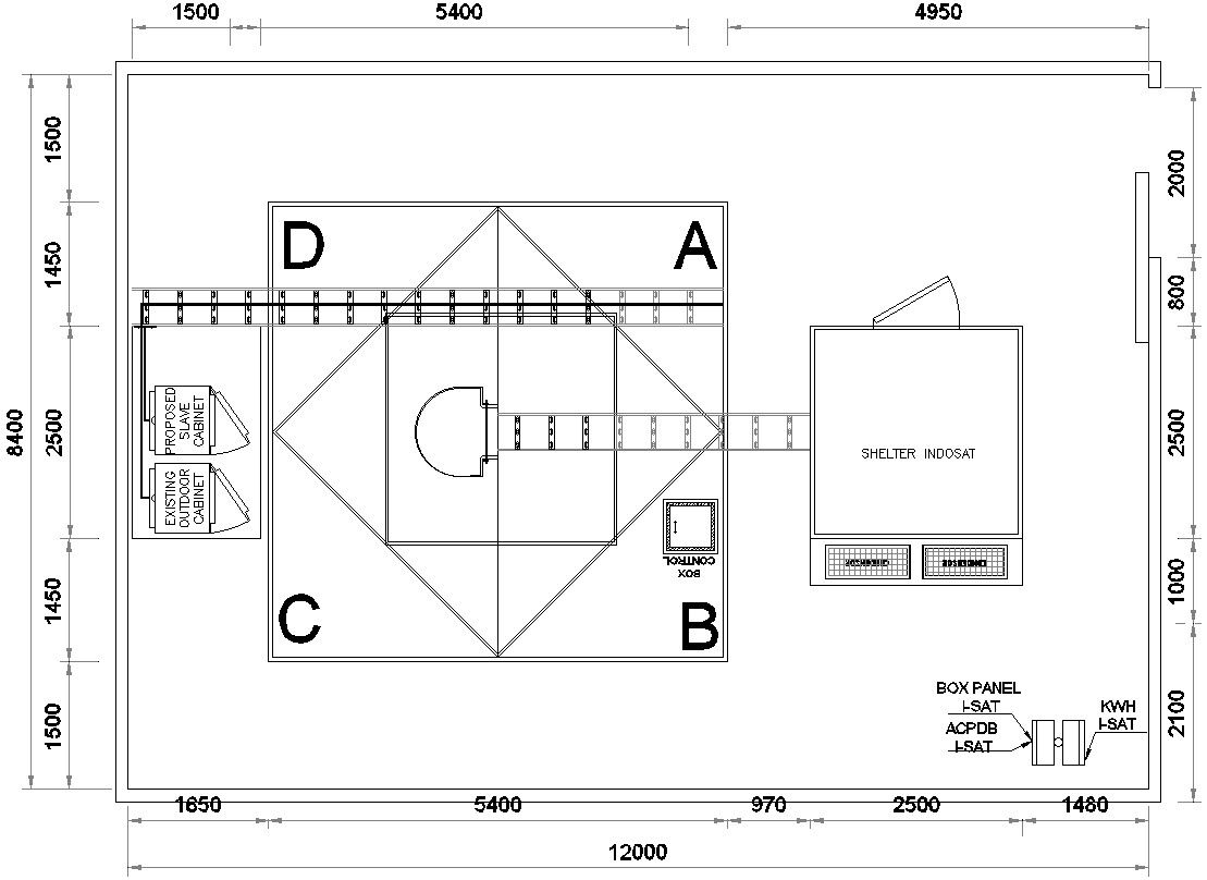 This architectural drawing is Base of the tower with detail AutoCAD drawing. In this drawing there were size of the plot is 12000x8400 given. There were box panel, proposed slave cabinet, existing outdoor cabinet etc. are given with details. For more details and information download the drawing file.
