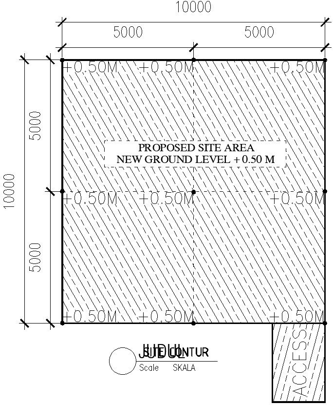 proposed site area of residential including in this drawing show differant layers of site area , new ground area is +0.50 M The site should be on elevated ground.It should have slope towards front street to afford good facility of drainage. Sites nearer to ponds ,pools of water,water logged areas must be avoided as they remain in damp condition . Sites near to high voltage power transmission lines are avoided. for more details of proposed site area of residential house download Autocad file ,cad drawing , dwg format .