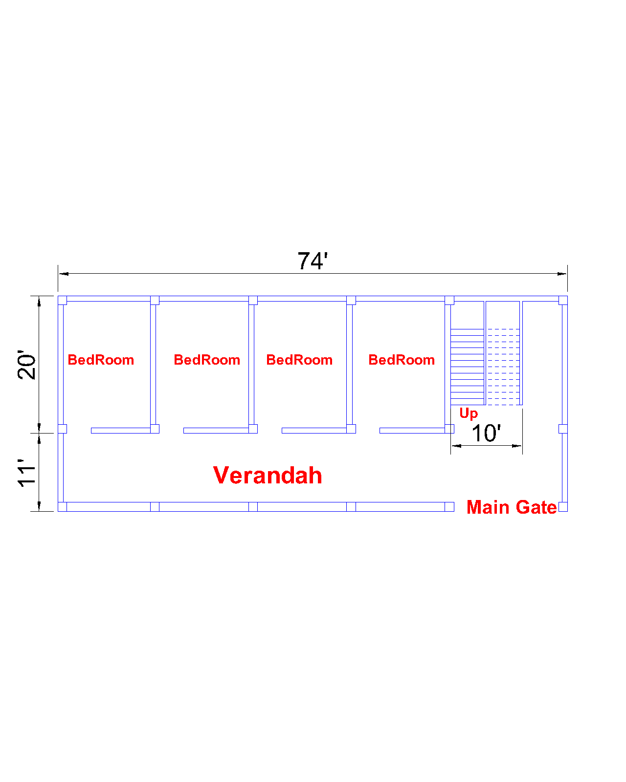 In village there are building house without of Hall/Common room so it's a open verandah house with 4bedroom and staircase