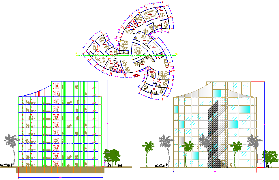 Office's architecture layout, sectional plan, sectional elevation of individual floor, exterior elevation.