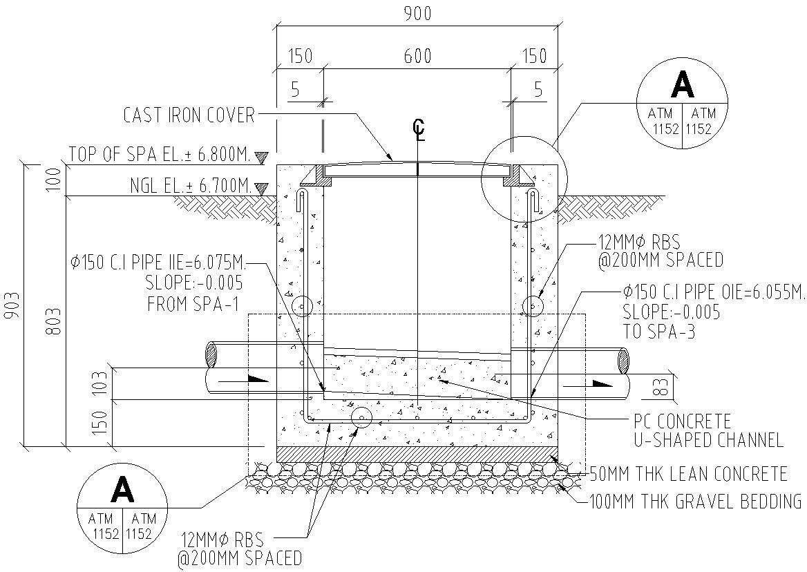 This architectural drawing is Design of manhole with detail AutoCAD drawing. In this drawing there were reinforcement bars with their spacing details, channel section, side wall section, iron cover section, slope detail etc. are given with details. For more details and information download the drawing file.