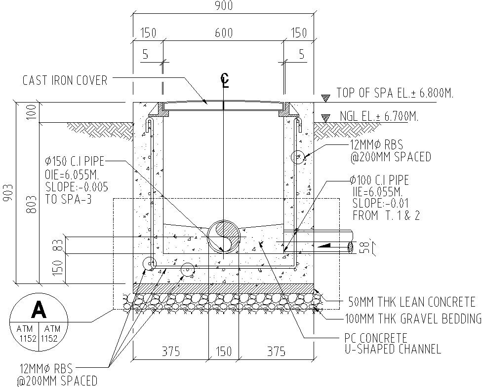 This architectural drawing is Manhole section with detail AutoCAD drawing. In this drawing there were size of the manhole is 900x903mm is given. There were cast iron pipe with slope detail, side wall section detail, reinforcement details, concrete details, gravel details etc. given. For more details and information download the drawing file.