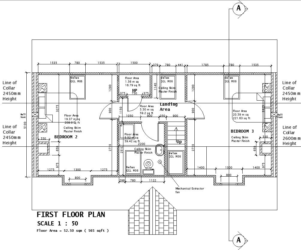 This architectural drawing is First floor plan of house with detail AutoCAD drawing. In this drawing there were two bedrooms, landing area, staircase, toilet, bathroom etc. are given with details. There were 52.50 sq.m. floor area is given. For more details and information download the drawing file.