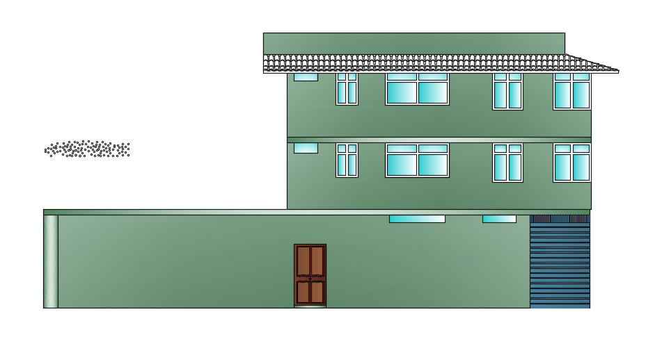7x11m house building left side elevation view is given in this model. This is three story residential building. Garden, and car parking is available on this ground floor. The total height of the building is 10.30m. The master bedroom window, bathroom ventilation, kitchen window, and dining windows are visible. The same above for the second floor building.