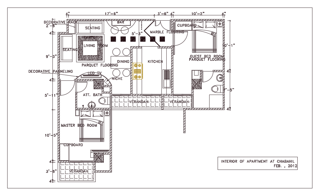 The apartment floor interior plan is given in this file. Here, the kitchen cupboard, decorative paneling, living room seating, master bedroom wardrobe, and guest room cupboards are provided. The marble flooring is provided to the entire floor. Parquet flooring is provided to the living room.