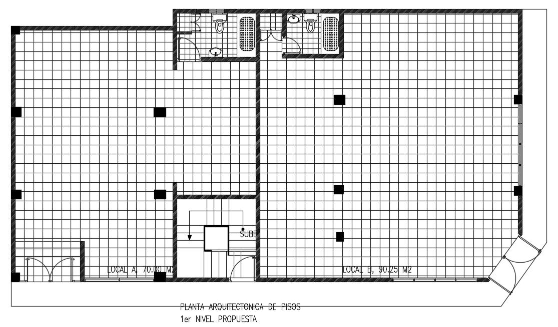 Architectural floor plan 1st level proposal 18x11m local shop plan is given. Here, two local shops with the attached bathroom is available.