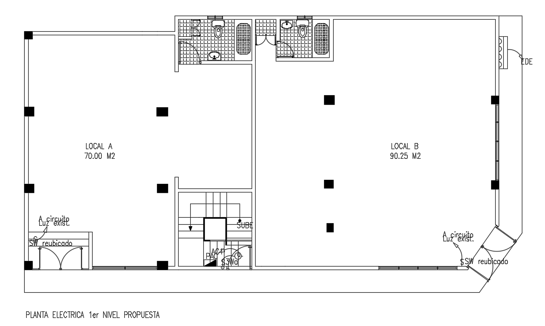 18x11m local shop electrical layout drawing is given in this model. This is a ground floor plan. Here, electrical lines are provided to the two shop entrance area, staircase, and toilets.