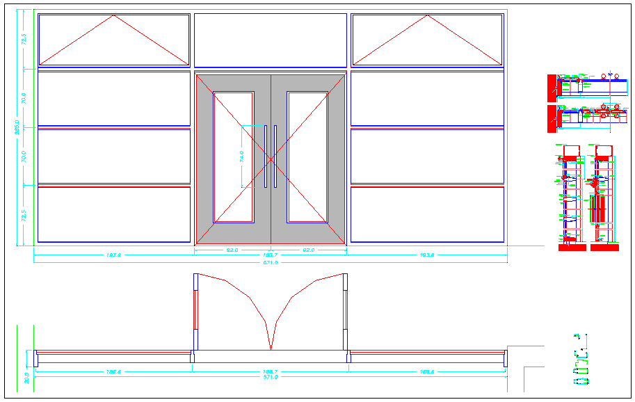Door view with opening and view of glass dwg file with door view and handle of round bar and wall view with door and dimensional detail of door and glass and sectional