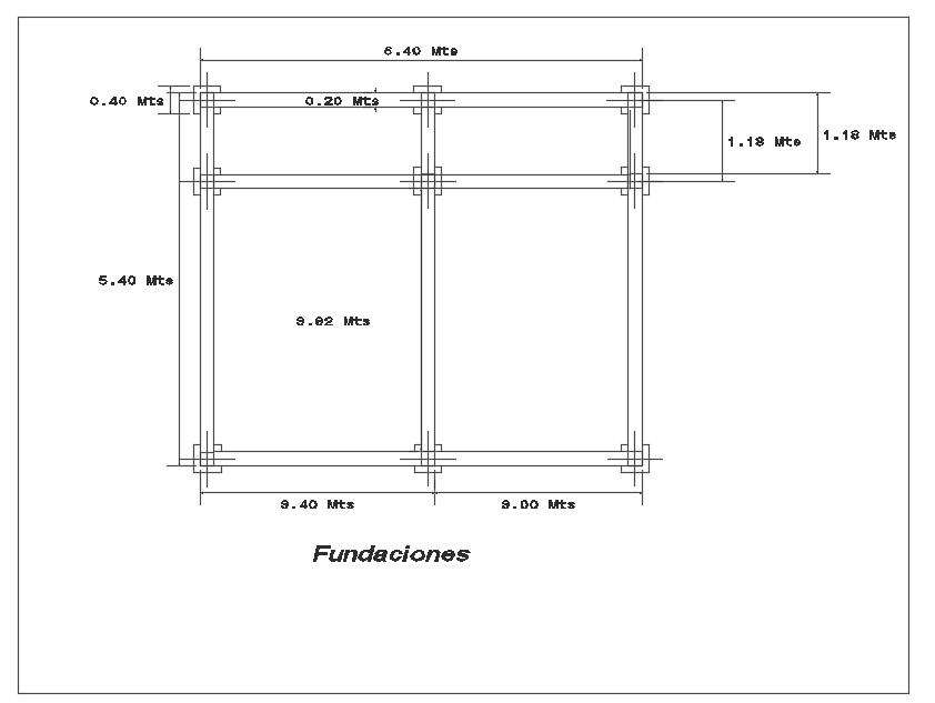 640x700cm two story house plan foundation detail drawing is given in this model. Here, totally 9 footing is provided. The distance of each foundation is mentioned.