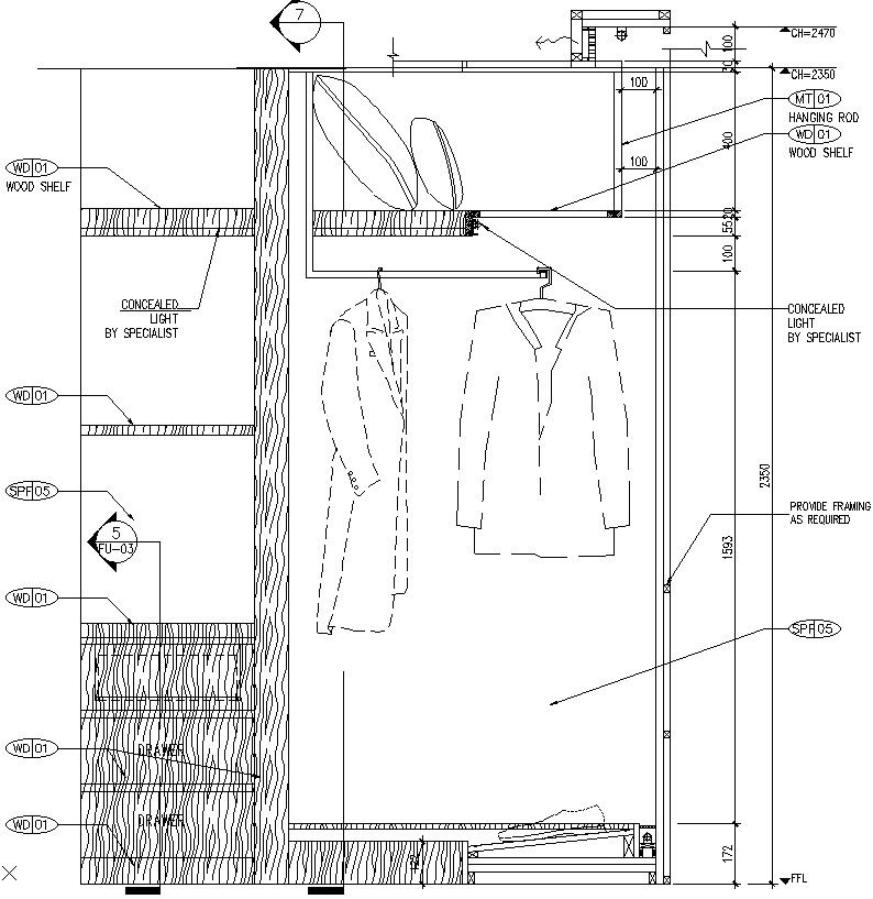 This Architectural Drawing is AutoCAD 2d drawing of Front Section of a wardrobe.